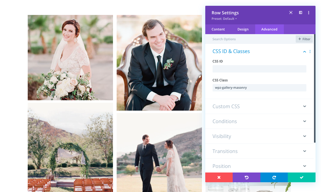 To apply the masonry layout to your gallery, you need to add a custom CSS class “wpz-gallery-masonry” to the section or row that contains the Divi Gallery module. Edit the section or row, navigate to the Advanced tab, and find the CSS Class option. Enter “wpz-gallery-masonry” as the custom CSS class and save your changes.